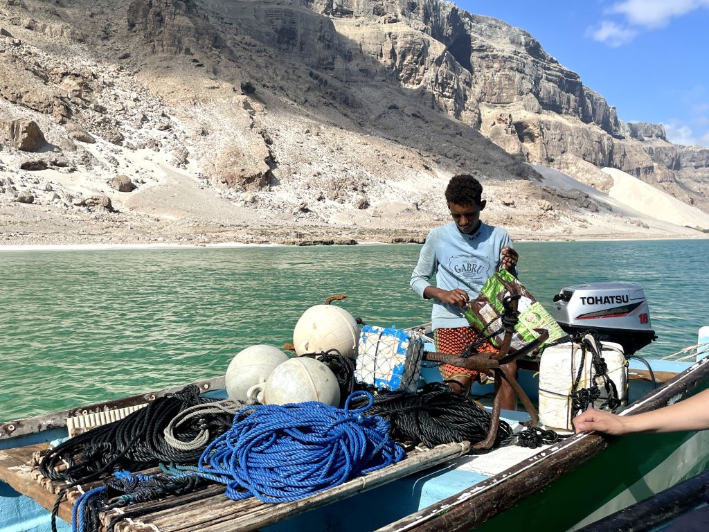 Der Mexikaner hatte sich auch für die Fischer und gegen die Höhle entschieden und so stachen wir mit unserem Koch und zwei Fischern in See. Beziehungsweise: wollten aufs Meer weit heraus, aber dann waren wir plötzlich mitten in Delfinen, die überall um uns herumsausten. Die „Spinner-Delfine“ rund um Socotra sind wesentlich kleiner als die, die wir zuletzt in Westafrika gesehen haben. Sie sind gefühlt schneller, aber trotz ihres Namens (den sie wegen ihrer Drehsprünge haben) ein wenig langweilig, weil sie weder herumsprangen noch irgendwelche Tricks wie Pirouetten oder andere spektakuläre Sprünge zeigten. Sie schwammen einfach um uns herum. Auch schön.