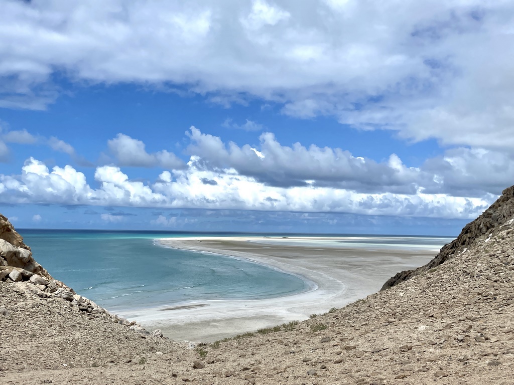 Unser Fahrer sprach eigentlich keine Fremdsprachen (außer etwas Arabisch), sondern nur die Inselsprache Socotri, aber wir hatten Spaß miteinander. Er signalisierte uns, dass wir die Augen schließen sollten und erst dann wieder öffnen, wenn wir anhielten. Wir gehorchten, er schaukelte einen Berg hoch und als das Auto stoppte und wir die Augen öffneten, lag vor uns eine traumhafte Lagune aus grellweißem Sand mit türkisblauem Wasser. Wow, einfach nur wow! Socotra hat eine Natur, die wirklich an jeder Ecke der Insel anders atemberaubend ist.
