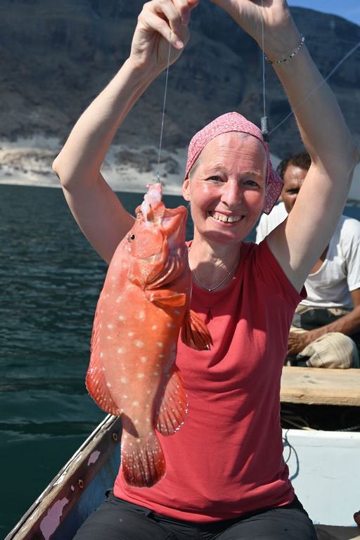 Als wir nach drei Stunden Fischen gar gegrillt zurück am Strand waren, schleppte der Koch den Fang zu seinen Utensilien und begann mit der Zubereitung. Wir „Fischer“ erzählten dem zurückgebliebenen Teil der Gruppe von unserem Ausflug und warteten auf die drei „Höhlenwanderer“, die auch bald völlig erhitzt eintrudelten. Gut, dass wir Fisch gefangen haben, sonst wären alle verhungert! Zumindest haben wir das so erzählt. Am Nachmittag kamen „Höhlenwanderer“ und „Fischer“ gleichermaßen nass geschwitzt und gar gegrillt zurück ins Hotel. Die Klimaanlage brummte, während wir nach kalter Dusche (Warmwasser gibt’s eh nicht) ein Nickerchen hielten. Socotra gefiel uns schon nach zwei Tagen sehr. Nur Natur – und davon so viel und so einzigartig!