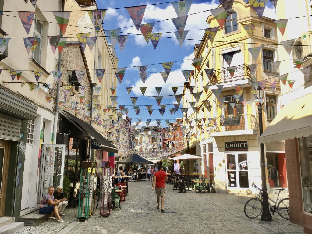 Wir hatten diesmal unser 13€ Zimmer in „Kapana“ (Bulgarisch für „Falle“), dem Kneipenviertel, das sich direkt an die Altstadt anschließt. Es fand gerade ein kleines Festival statt, bei dem es in der gesamten Fußgängerzone Stände mit Handwerkskunst gab. Super schön! Es gab leckeres Essen und wir flanierten durch die Gassen und freuten uns, wie manchmal die Dinge so laufen, denn eigentlich wollten wir nur Wäsche waschen und waren nun auf einem Handwerkskunst-Festival! Eigentlich wären wir gerne noch eine zweite Nacht geblieben, aber unser Zimmer war nicht mehr frei, sodass wir einfach erst am späten Nachmittag losfuhren.