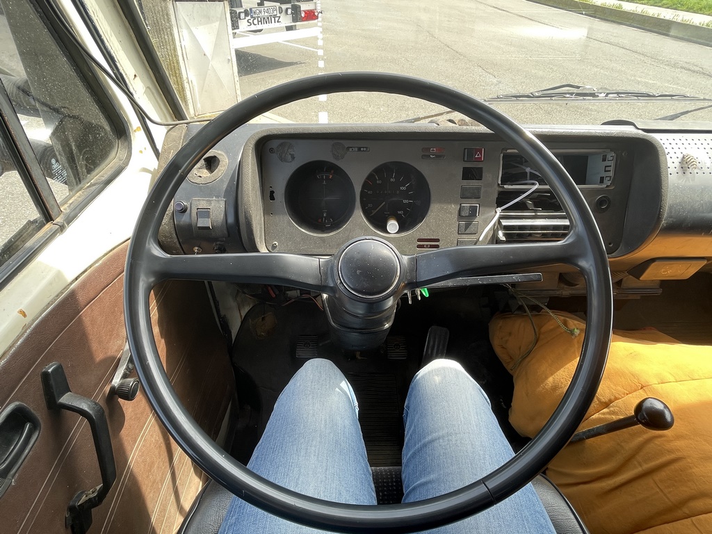 Die wahrscheinlich häufigste Frage. Er ist zu groß. Die Aufbaubatterie für den Wohnraum befindet sich direkt hinter dem Fahrersitz von Sunshine, weswegen man den Sitz nicht weit genug für Jans lange Beine zurückschieben kann. Wir hatten die Erlaubnis, umzubauen, haben es aber gelassen, weil es einfach nicht nötig war.