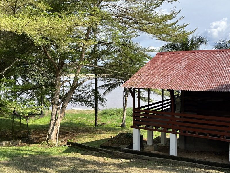 Unser „Krankenzimmer“ war natürlich neu möbliert und renoviert mit dunklen Holzwänden und bunten Vorhängen, sodass es sich eher wie eine Lodge als wie ein Krankenhaus anfühlte: eine Wand zum Fluss hin völlig offen und durch das Mosquitonetz konnte man vom Bett aus auf den Fluss schauen, über den Albert Schweitzer seinerzeit jedes Mal aus Europa angereist ist.