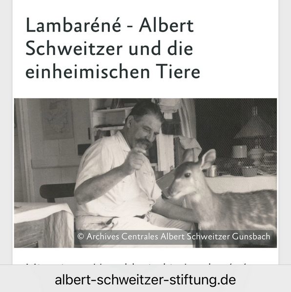 Albert Schweitzers Philosophie war „Ehrfurcht vor dem Leben“ und er machte keinen Unterschied zwischen Mensch und Tier. Er hatte eine Katze, einen Pelikan und zwei Antilopen als Haustiere. Die Katze habe ich vermisst, aber einen Pelikan (namens Albert) und eine Antilope gibt es bis heute. Anti, die Antilope ist handzahm und hat einen verkrüppelten Huf, wahrscheinlich von einer Falle.
