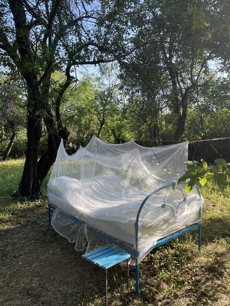Die neue Matratze haben wir an unserem 9. Hochzeitstag auf einem unserer liebsten Übernachtungsplätze Bulgariens eingeweiht: ungewohnter Luxus, nun auf der vollen Breite schlafen zu können! Aber natürlich sehr bequem. Seitdem wir das Gartenbett haben, wissen wir abends nie genau, wo wir schlafen möchten: in Hans mit Reh und Fuchs zu Sonnenaufgang oder im Gartenbett mit Dachsgequietsche am Abend und Eichhörnen am Morgen? Die Qual der Wahl im Paradies. Drinnen schlafen werden wir in Afrika noch oft genug – da sind einfach viel zu viele Menschen zum Wildcamping.