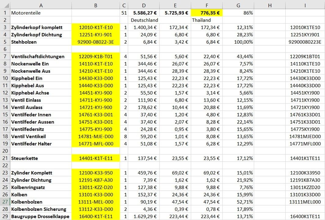 Warum wir nicht beim örtlichen Honda-Händler eingekauft haben, sondern aus Thailand importiert haben? Ganz einfach: weil Honda in Europa de Kunden vergackeiert und die Europäer sich mit Wonne vergackeiern lassen. Schaut Euch die Liste an: der tailändische Honda-Händler ruft ähnliche Preise auf wie seine Kollegen in den USA oder Australien, aber die Europäer das bis zu Neunfache dieser Preise. Und wenn Ihr genauer schaut sehr Ihr, dass die Europäer zwischen Februar und Mai einfach mal die Preise um 2,5% erhöht haben. In Europa hätte uns der Karton Teile 5700€ gekostet (bei einem Motorrad, welches neu 6000€ kostet), aus Thailand haben wir inklusive Porto und Einfuhrzoll rund 1200€ bezahlt. Dafür unterschreibt man dann doch gerne, dass Honda keinen russischen Stahl für explizit zwei Schrauben verwendet…