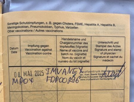 Nachdem es uns letztes Jahr wegen „falscher Neigung“ verwehrt worden war, uns gegen Mpox (Affenpocken) impfen zu lassen, haben wir es dieses Jahr endlich doch geschafft. Letztes Jahr hatten wir es im Tropeninstitut Hamburg versucht, wurden aber, obwohl wir tatsächlich in den Kongo fahren, wo die Epidemie herrscht) belogen, dass „so eine Impfung noch erfunden werden muss“. In Wahrheit wollte uns die Ärztin nicht sagen, dass die werte STIKO beschlossen hatte, den Impfstoff nur an homosexuelle Männer abzugeben, hauptsächlich in Berlin. „Derzeit Männer ≥18 Jahre, die Sex mit Männern haben (MSM) und dabei häufig die Partner wechseln.“ Die WHO hat schon im Sommer 2024 „eine gesundheitliche Notlage von internationaler Tragweite (PHEIC) für Mpox erklärt.“ Naja, die Welt dreht sich ja um Deutschland, da kommt Mpox dann auch nicht vor… Dass es im April 2025 in Berlin schon mehr Infektionen gibt als in 2024 gesamt, könnte eine Folge sein. Aber was wissen wir denn… Die STIKO ändert die Direktive nicht, aber wir haben eine Impfpraxis in Hamburg gefunden, die das eher kommerziell sieht: wer geimpft werden will, wird geimpft. Für 390€ pro Spritze, die es uns wert sind. Außerdem gab’s dort auch noch die zweite Impfdosis gegen Dengue für uns.