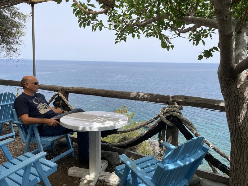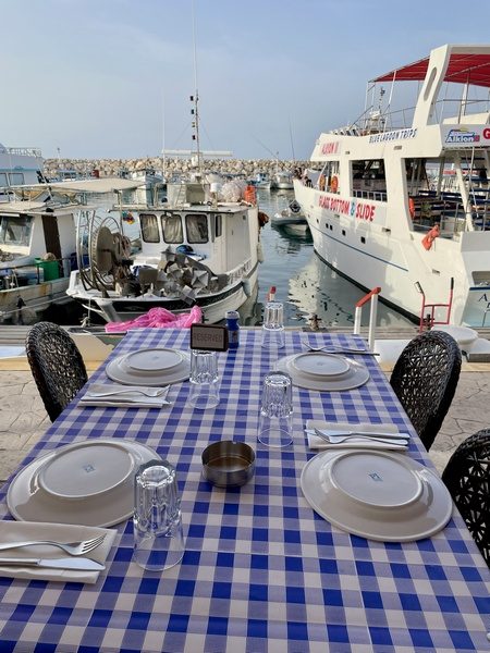 Wir waren abends an der nördlichen Küste mit Reisebekannten verabredet. Dagmar und Bruno hatten wir zuletzt 2020 in Riga getroffen. Mitten in der Pandemie saßen wir damals zu viert beim vollen Italiener und schlemmten. Das wollten wir wiederholen, denn die beiden waren mittlerweile auf Zypern „hängen geblieben“ und hatten ein Haus gemietet. Kaum dass wir uns von der Südküste entfernten, wurde die Landschaft grüner und es gab keine „Rothäute“ mehr. Dagmar und Bruno hatten definitiv die schönere Seite des Landes gewählt! Unsere Unterkunft in Polis (65€ Apartment mit Pool und Frühstück) war in britischer Hand und die Einrichtung aus den 1970er Jahren mit viel blauer Farbe von „braun“ auf „blau“ gemalert worden, aber wir hatten uns schon von dem Gedanken verabschiedet, eine authentische Unterkunft zu finden. Wir fuhren nach Latchi und verbrachten dort, direkt am kleinen Hafen am Wasser sitzend, einen schönen Abend zusammen – mit richtig gutem gegrilltem Oktopus und Pilzen in Knoblauchsauce. Essen gut, Gesellschaft gut, Gespräche gut – Zypern besserte sich.