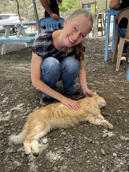 Es war mein Geburtstag und ich hatte das dringende Bedürfnis nach „schön“ und wir kurvten auf Empfehlung von Dagmar und Bruno die Küstenstraße entlang. Dort fanden wir tatsächlich ein Eckchen nach unserem Geschmack: (Automaten) Kaffee mit Blick von der Steilküste auf Fischer, die in den Felsen Oktopusse mit Harpune jagten. Und mit einem riesigen Kater, der sich sehr liebevoll um seine „Kundschaft“ kümmerte. Ein richtiges Geburtstagsgeschenk, der Ausblick und Kater zusammen.