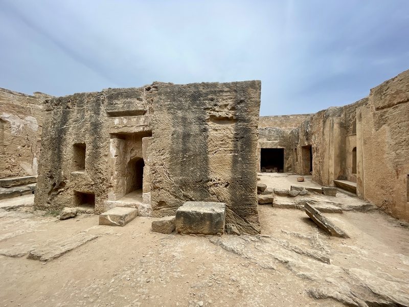 Doch zurück zu den Königsgräbern, die keine sind. Es handelt sich dabei um ganze „Grabwohnungen“, die in die Tiefe gebaut wurden. Unterirdische Totenhäuser mit Innenhof und diversen Räumlichkeiten und Grabnischen, die eine ganze Nekropole am Meer bildeten. Für die 2,50€ Eintritt bekam man zwar keine Beschilderung, aber wir hatten schnell den Blick raus, wo die QR-Codes zu scannen waren, die uns die diversen Grabstätten erklärten.