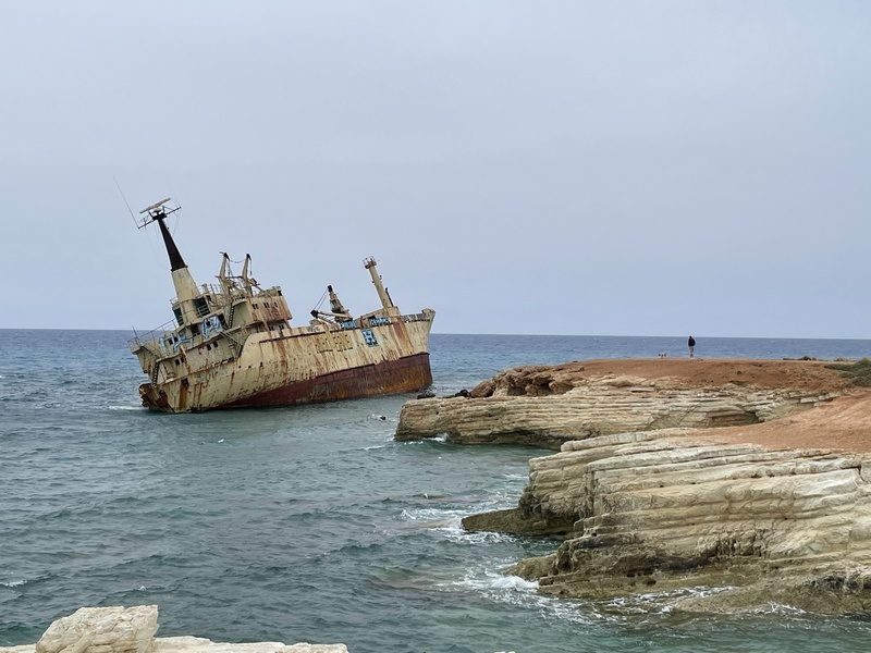Vor der Küste lag ein Schiffswrack und wir wussten: es gibt noch eins, ganz nah an den „sea caves“, den im Reiseführer beschriebenen Brandungshöhlen, die auch sehenswert sein sollten. Die Edro III liegt mit ziemlicher Schräglage seit 2011 an den Felsen und rottet so vor sich hin. Alle Schmierstoffe und was sonst noch so die Umwelt gefährden könnte sind mittlerweile abgelassen, aber geborgen wird das Wrack nicht – wie so immer zahlt die Versicherung nicht. Wir haben in den letzten Jahren so viele Wracks gesehen, bei denen die Versicherung die versicherte Bergung nicht zahlt und das hat nichts mit der Herkunft des Schiffes zu tun, sondern generell damit, dass Versicherungen nur dazu da sind, den behördlichen Vorschriften zu genügen. Weltweit. Und nicht nur für Schiffe…